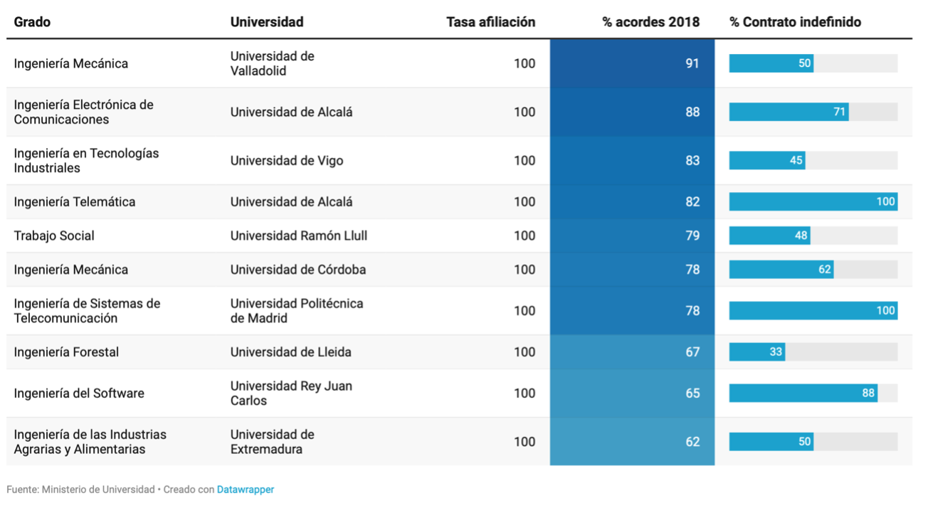 En cuanto a los 50 grados con mayor empleo, se encuentran: